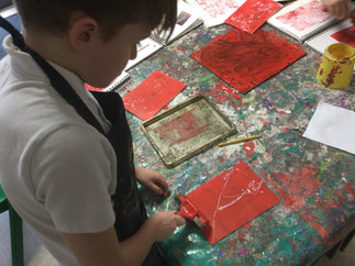They carved their design onto polystyrene tiles and then used paint and rollers to print their design onto paper and material.